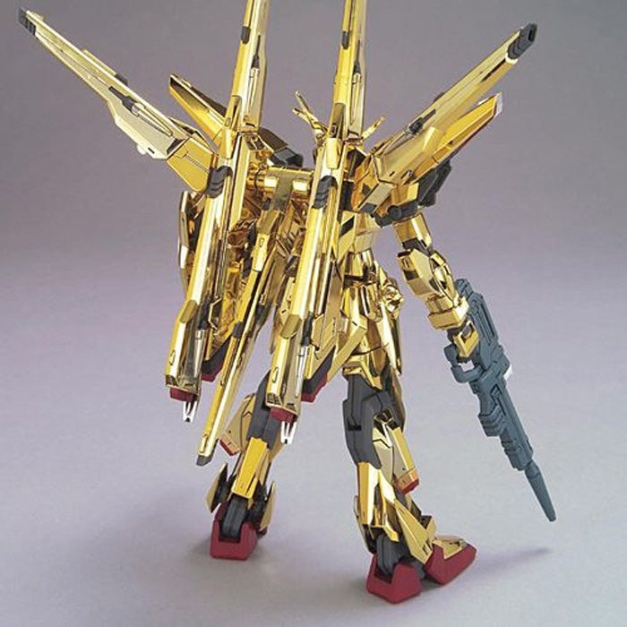 This 1/100-scale kit of the Akatsuki Gundam with its gleaming golden parts is irresistible to those who love mechs in shining armor! Akatsuki Gundam comes with two optional packs, the Oowashi and Shiranui packs, that can be attached to its back. Armaments include a beam rifle, shield, and two beam sabers that can be connected to form its signature double-bladed beam saber. A display base is included along with custom decals for detailing up your completed kit.
