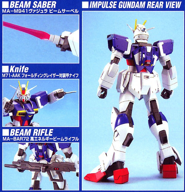 Very nice 1/100 scale model of the Force Impulse Gundam, piloted by Shinn Asuka, in the series "Gundam SEED Destiny." With parts molded all in color, and featuring snap assembly, no paint or glue are required to build this versatile machine! The completed Force Impulse Gundam can be "broken down" into its separate component machines: the Core Splendor, Chest Flyer, Silhouette Flyer/Force Silhouette, and the Leg Flyer. A Beam Saber, Knives, and a Beam Rifle are included to keep your Force Impulse Gundam ready to fight! A clear plastic "character plate" with a picture of Shinn Asuka, and with his vital statistics on it, is included (as is a plastic base to stand up the plate). An added bonus is a "how to build Force Impulse Gundam" model, outlining how to paint the kit for a more accurate finished model (all text is in Japanese, but some of the techniques can be picked up just from the photos). Scale: 1/100 Item Size/Weight: 31.0cm x 19.8cm x 11.0cm / 500g Release Date: Dec 2004