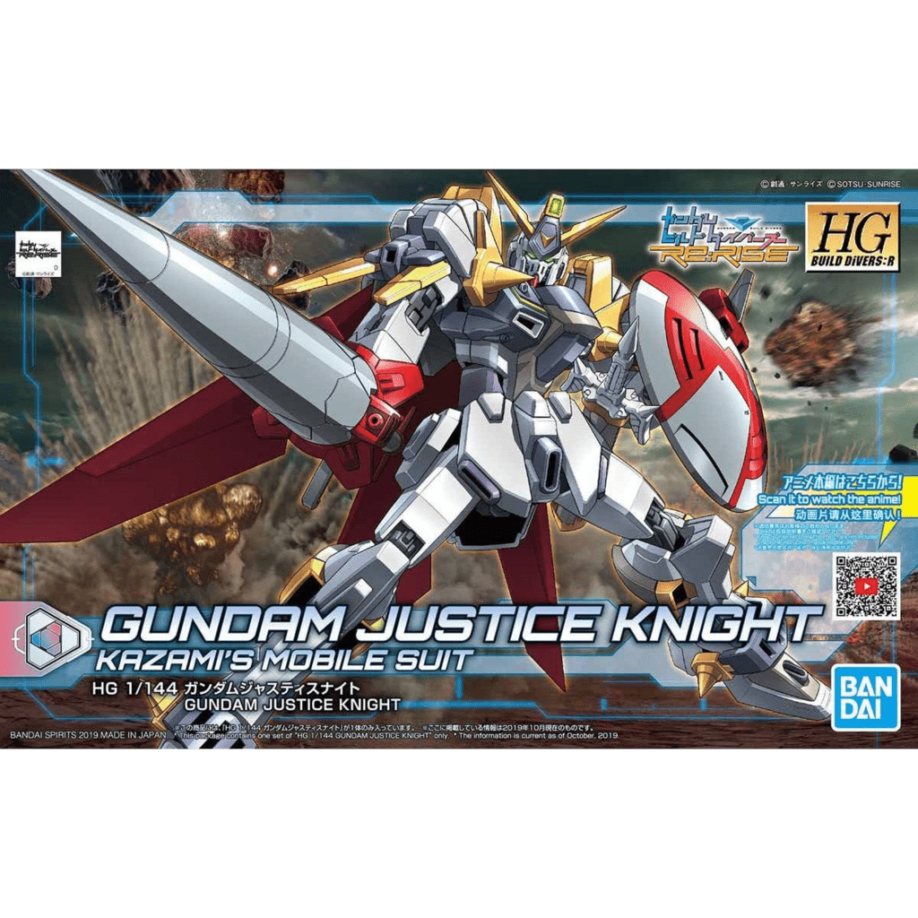 Bandai brings us the Justice Knight from "Gundam Build Divers: Re:RISE"! With a strong knightly motif, this model comes with accessories that really boast that role a lance, circular shield and a cloak-style wing. A new hip mechanism enables incredible articulation and dynamic poses for multiple displays. Accesories: One-handed sword - Lance - Back wings -Shield - Foil sticker Scale: 1/144 Item Size/Weight: 29.8cm x 18.8cm x 7.7cm / 330g Release Date: Oct 2019