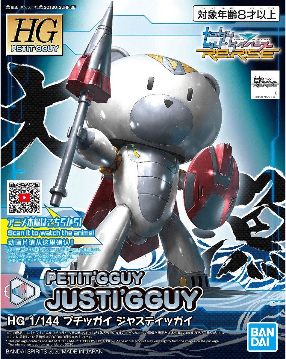 From the Petit'gguy lineup comes a new design based on the Justice Knight from "Mobile Suit Gundam Build Divers Re:RISE"! He comes with a lance, shield, and even a mini cape! A puzzle piece-shaped base is also included so you can connect his base to other Petit'gguys in the series. Grab him today! Set Contents: Lance - Shield - Cape - Base. Scale: 1/144 Item Size/Weight: 19.0cm x 15.0cm x 6.5cm / 120g