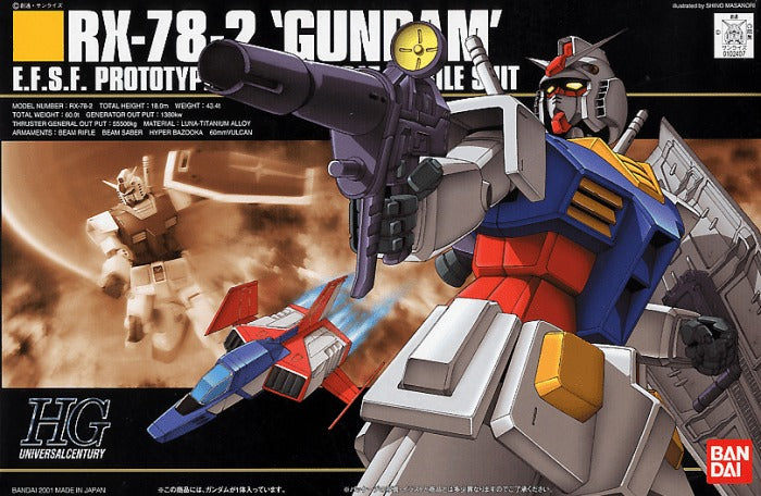 HGUC version of the RX-78-2. Molded with Bandai's patented multi-gate technology which allows multiple colors on one tree. Includes shield, bazooka and beam rifle. Release Date: May 2001 Scale: 1/144 Item Size/Weight: 29.0cm x 19.0cm x 6.0cm / 310g
