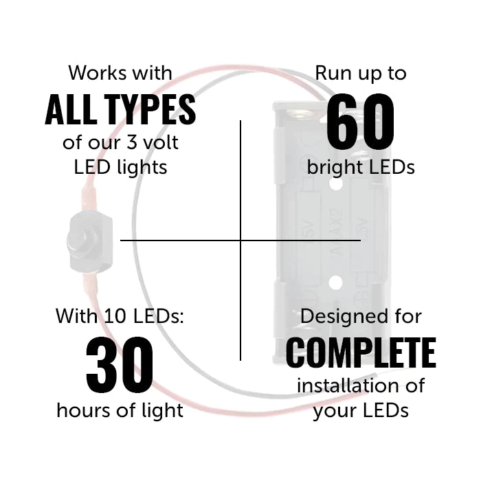 This is another way to run your 3 volt LEDs. This 3 volt output AAA holder can run chips, 1.8mm, 3mm, 5mm or a mix of all sizes at once. And it can run more lights for longer than a coin cell holder/coin cell.
