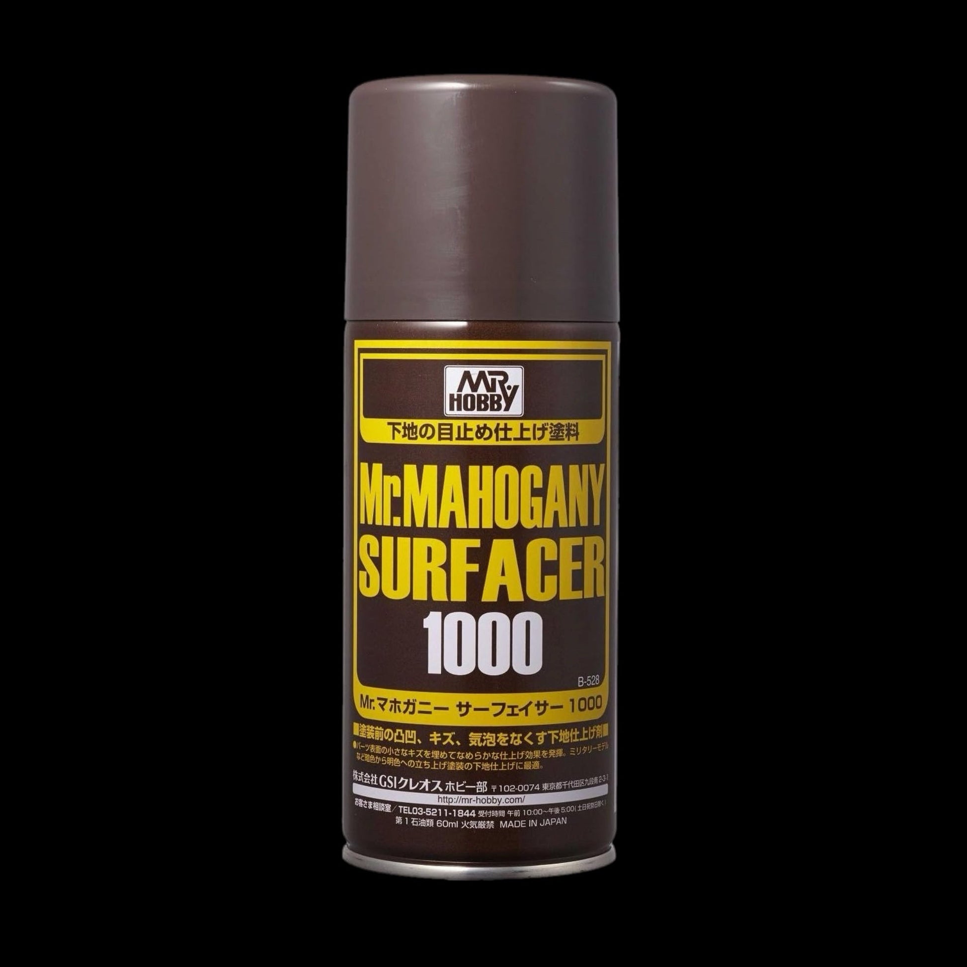 B528 Mr. SURFACER 1000 contains fine granules. They are use in same way as other surfacers and due to the finer granules after sanding with waterproof sand-paper, a perfectly corrected surface is possible. Available in bottle and spray. Provides neutral Mahogany color background and prepares surface for paint application. 170ml.