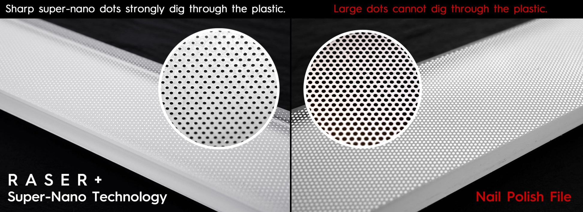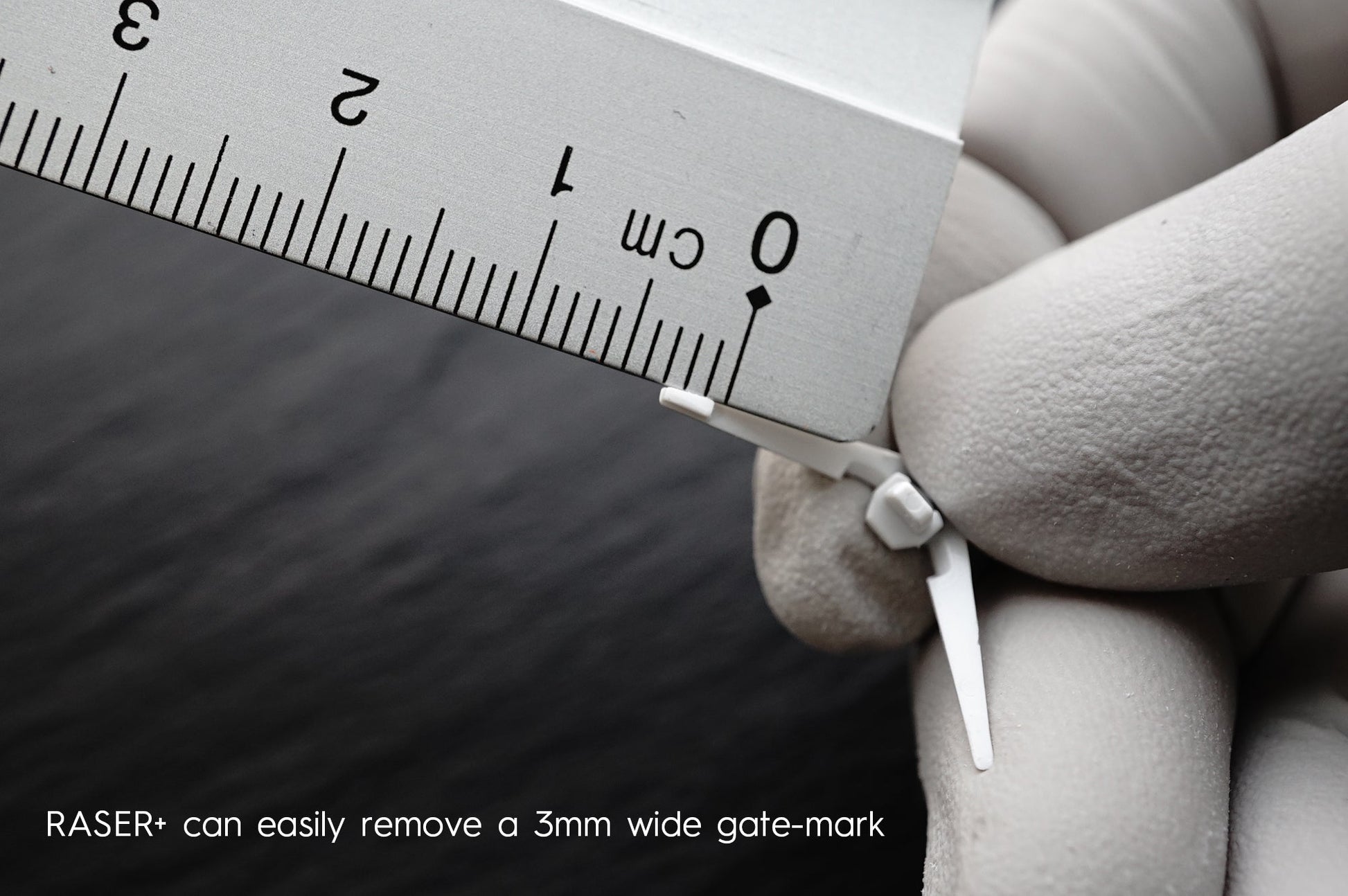 RASER PLUS specializes in thick gate removal using its proprietary Super-Nano Technology, which provides a powerful sanding experience without leaving scratches on the surface. Its 5mm thickness is suitable for a more stable and better grip working on large parts with thick gates, making this tool a perfect solution for removing gates!