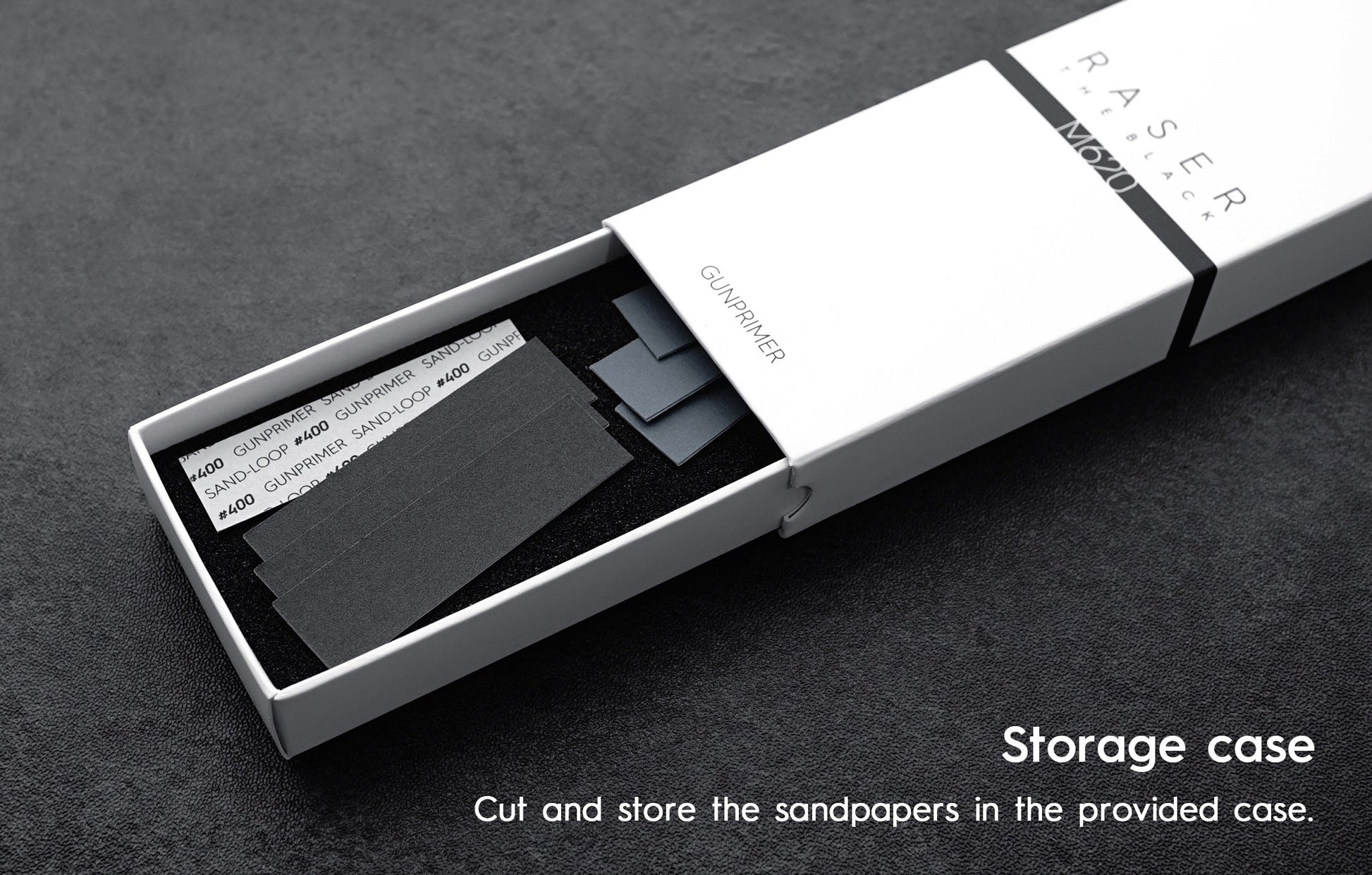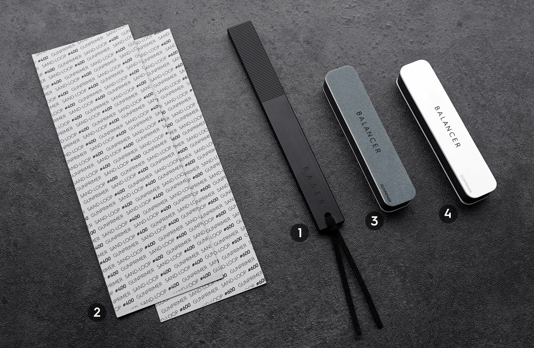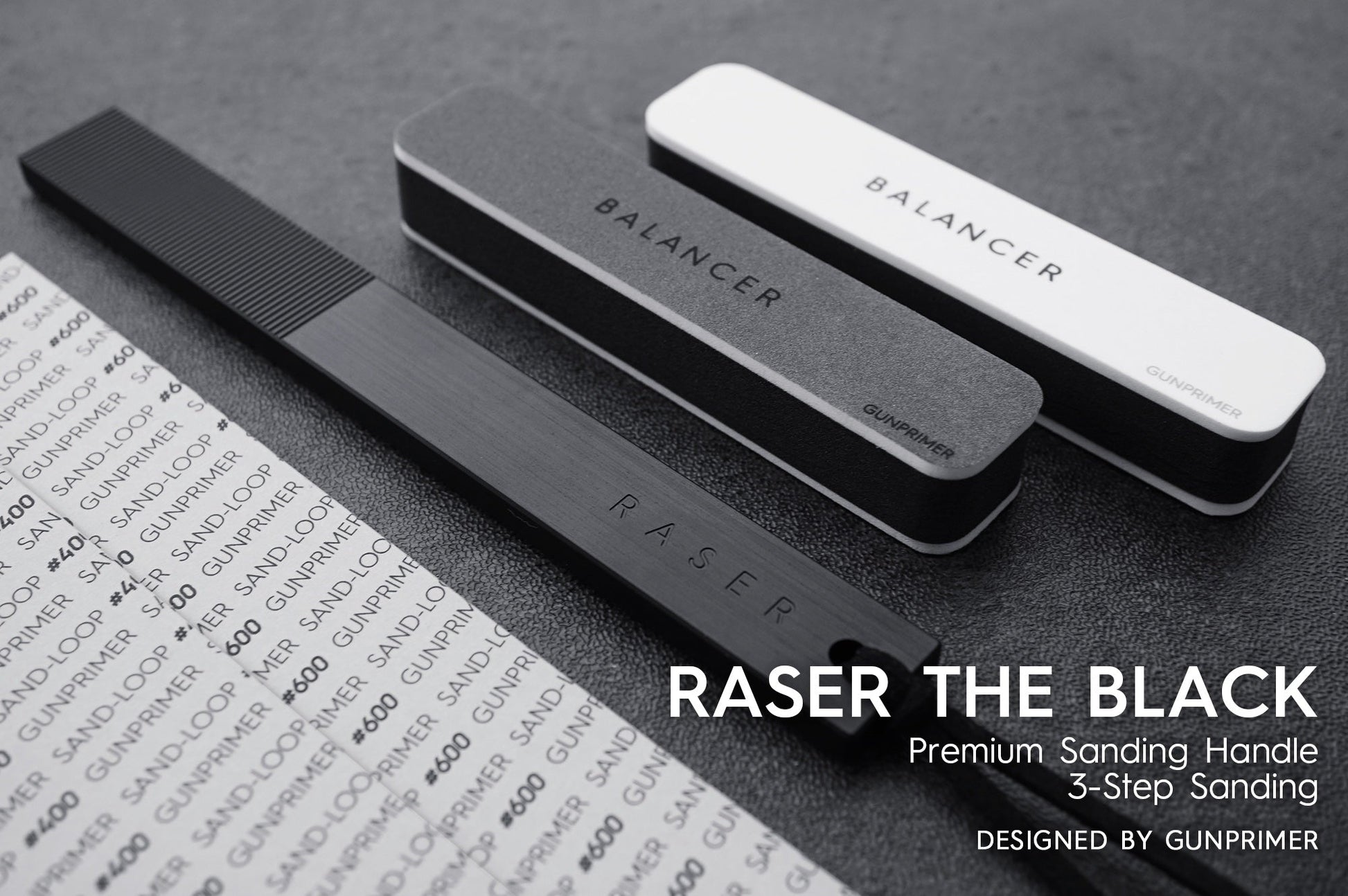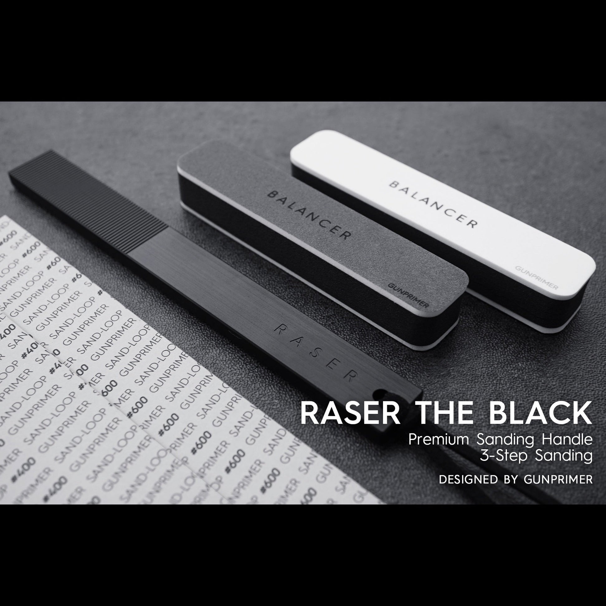 Using RASER THE BLACK with the enclosed SAND-LOOP and BALANCER, users can experience GUNPRIMER's unique 3-step sanding. For additional information about 3-step sanding, please see the "What is 3-Step Sanding?"