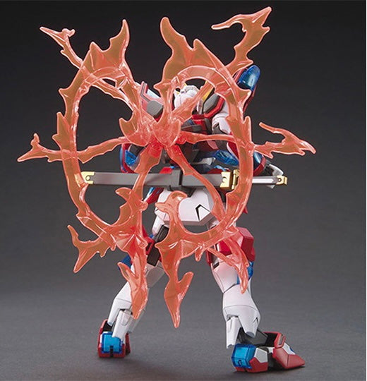The Kamiki Burning Gundam from Gundam Build Fighters Try is ready for battle! In addition to an array of weapons, Kamiki Burning Gundam features a sword that can be mounted on the rear waist and a flame effect part.
