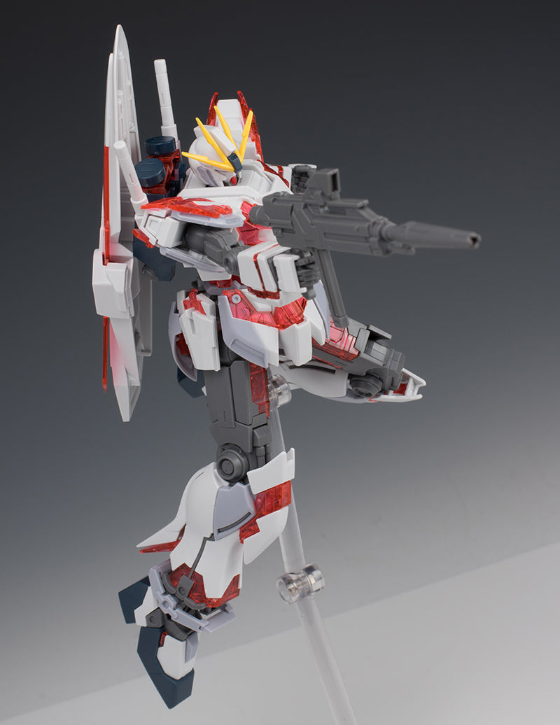 Narrative Gundam's clear parts allow the recreation of the psycho-frame equipment reminiscent of the Gundam Unicorn. Use the different stickers to recreate the red Beserker Mode from the movie!