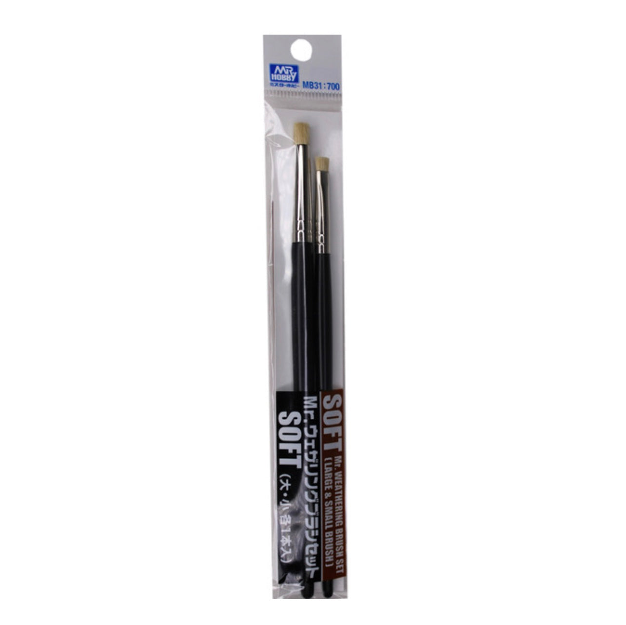 From GSI Creos comes this set of two Mr. Weathering brushes, a large brush and a small one. These brushes are useful for weathering models, just apply a bit of paint to the tip of the brush, wipe off excess moisture and then rub the brush on the object.