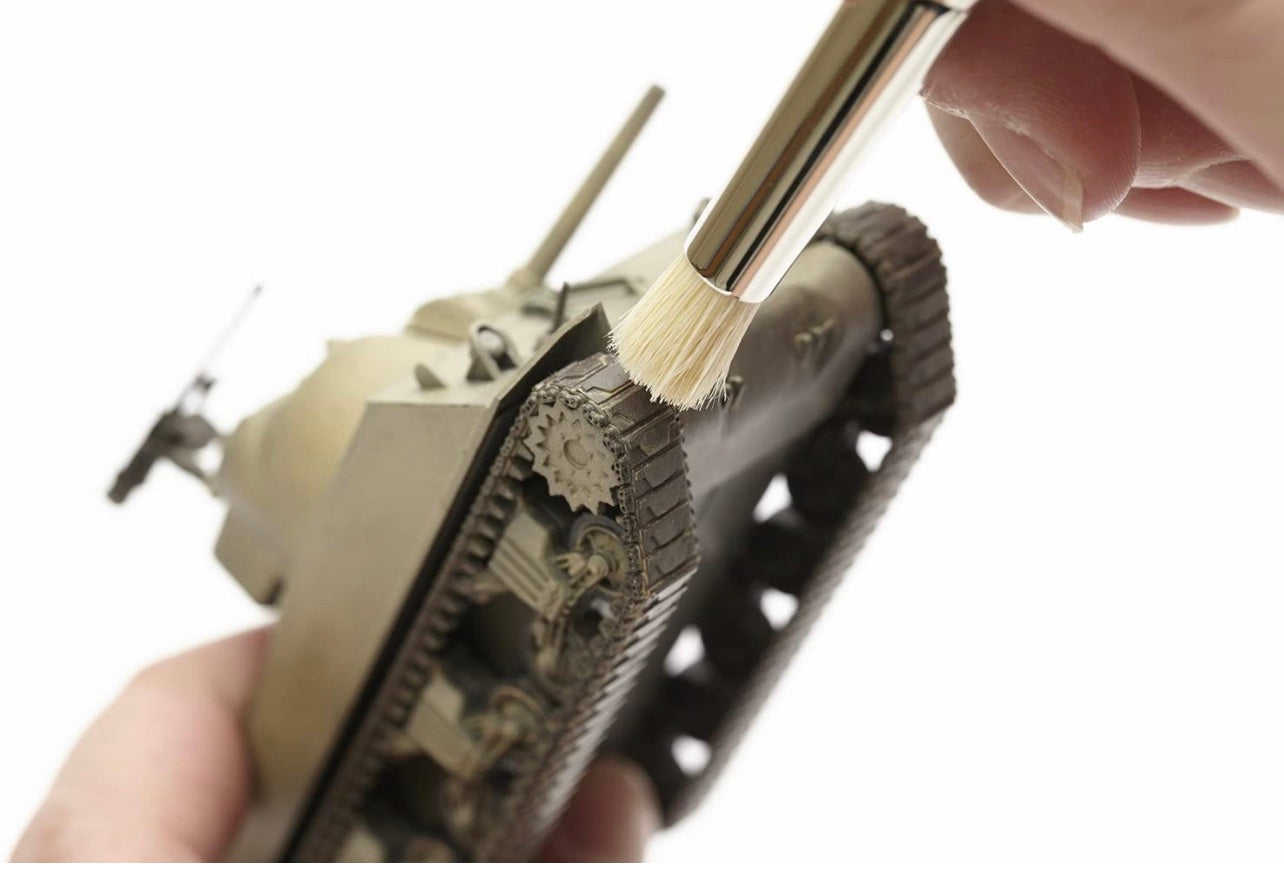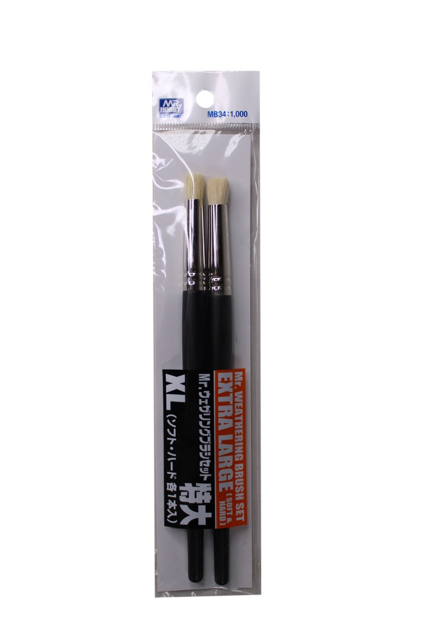 A set of extra large sized brushes suitable for large models and in the Mr. WEATHERING BRUSH lineup. It come as a set of 2 brushes; hard brush and soft brush. Extra large brushes have animal hair bristles of different hardness. You can reproduce a wider range of weathering by using these brushes delivering different widths and textures.