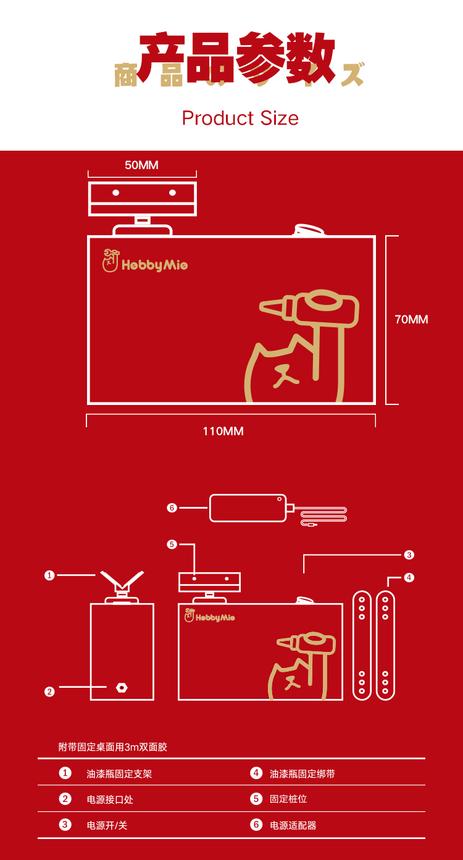 Paint shaker. Contains: 4x straps, 1x power adapter, 1x paint shaker unit, and 2x adhesive strips. Uses Type-A plug.