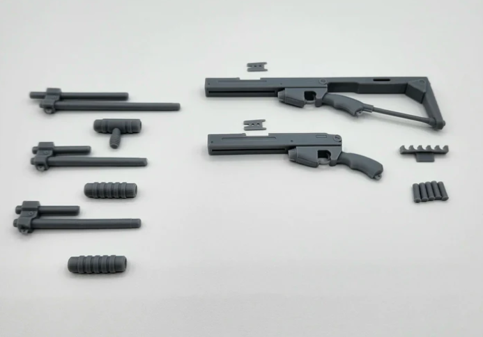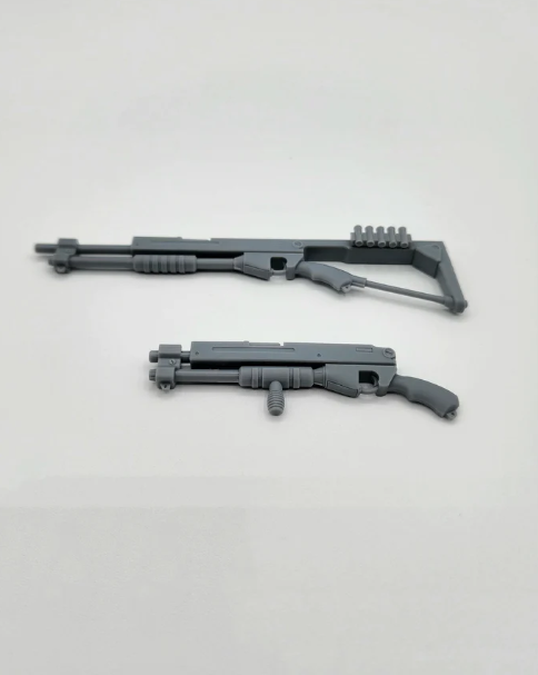 Weapon is made from 3D printed resin. The kit is made up of 16 individual pieces and can make both the short and long shotguns. The parts can be interchanged to create the desired configuration.