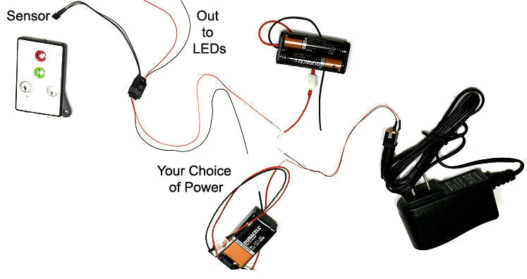 AC / DC (up to 19 Volts) - Use this option with any hobby transformer, or other power supply that are 12 volts or more. This option has 2 black wires that connect to your power supply as the polarity of the input doesn't matter. The lights you use need to be rated for the same voltage as your power supply, and must be at least 12 volts.
