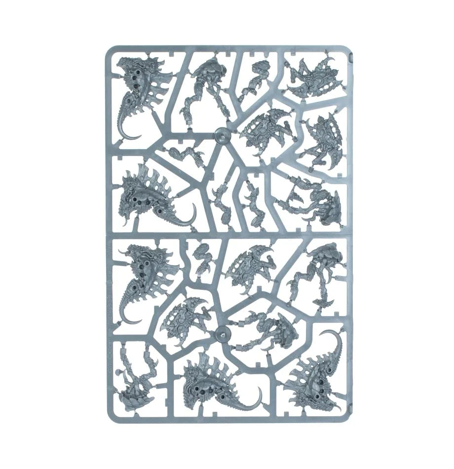 This multipart plastic kit builds five Barbgaunts – Tyranid creatures engineered as biological artillery. Each of these hunched and hulking gaunt-forms is fused to a grotesque barblauncher – five stout limbs serve to support its living weapon or provide a stable firing platform, while the sixth is little more than an atrophied talon. These beasts of burden are controlled by cerebral parasites, fleshy tendrils digging into each Barbgaunt's eyeless skull to direct its organic payload.